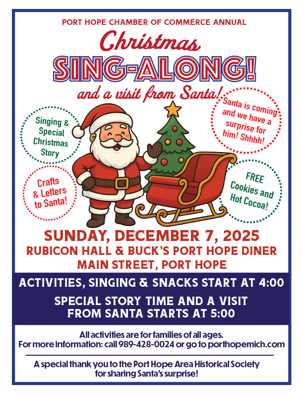 This year we have a surprise for Santa! Shhhh . . . don’t tell him! We are partnering with the Port Hope Area Historical Society and will have a special story time followed by a visit from Santa at Rubicon Township Hall. Christmas activities and singing, hot chocolate and cookies start at 4:00 at Buck’s Port Hope Diner and Rubicon Twp Hall and story time and Santa’s visit start at 5:00 at Rubicon Twp Hall. Hope you’ll join us!
